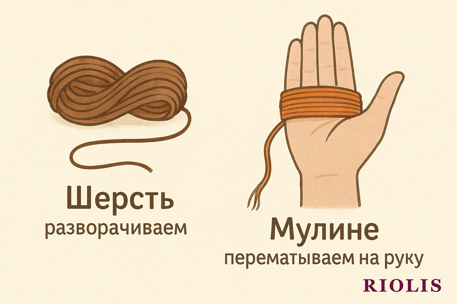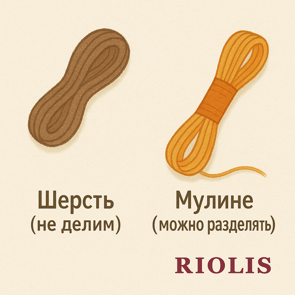 Обратите внимание на то, что шерстяные нити и хлопковое мулине в наборах РИОЛИС скручены по-разному.