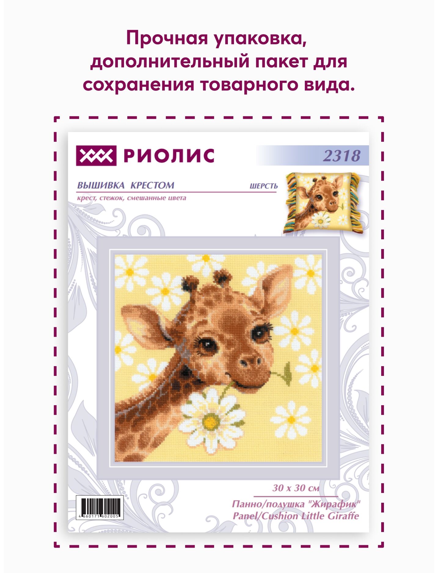 В данном наборе нет ткани для оборотной стороны подушки. Ее можно приобрести отдельно в разделе сопутствующие товары.