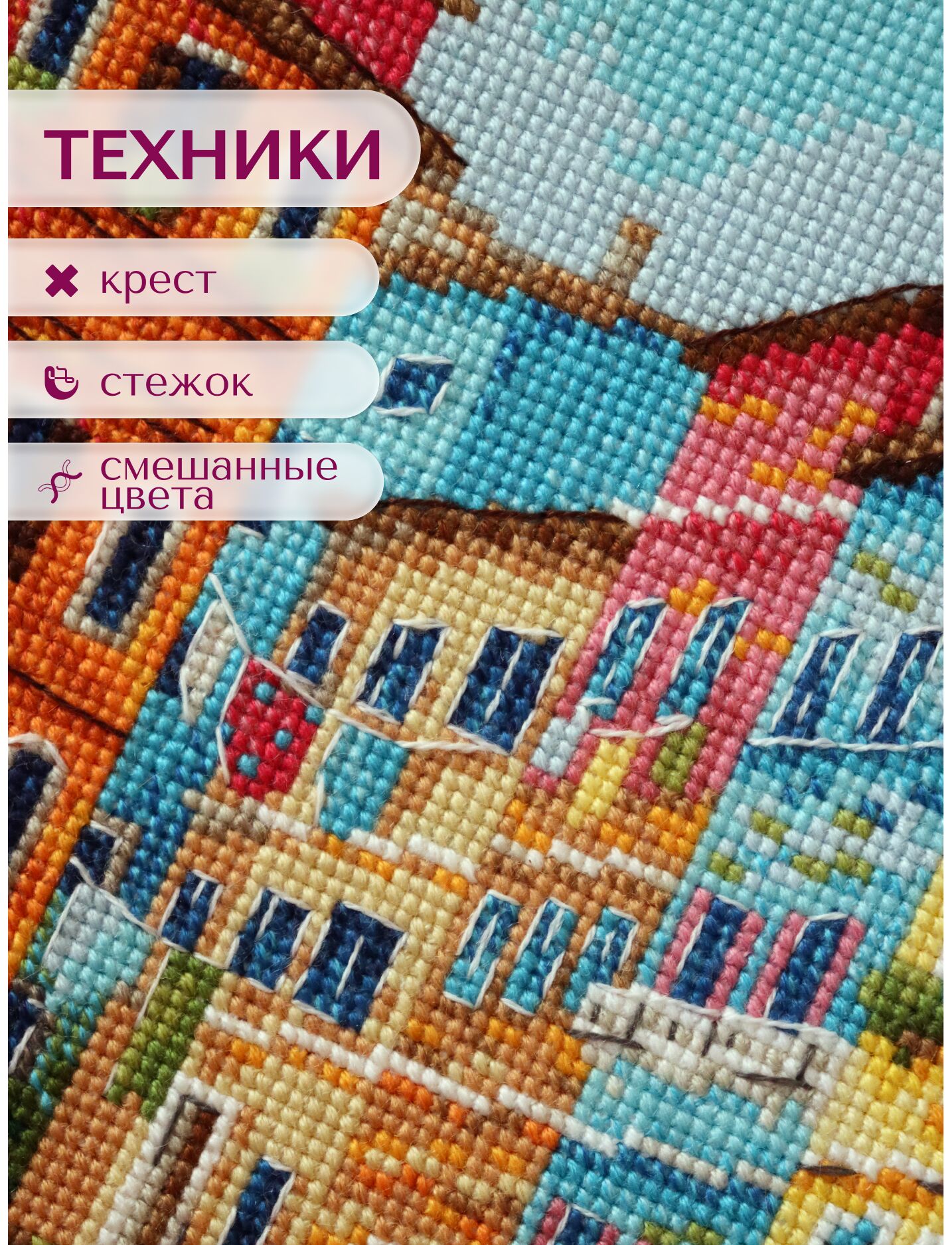 В наборе используются техники: крест, стежок, смешанные цвета.