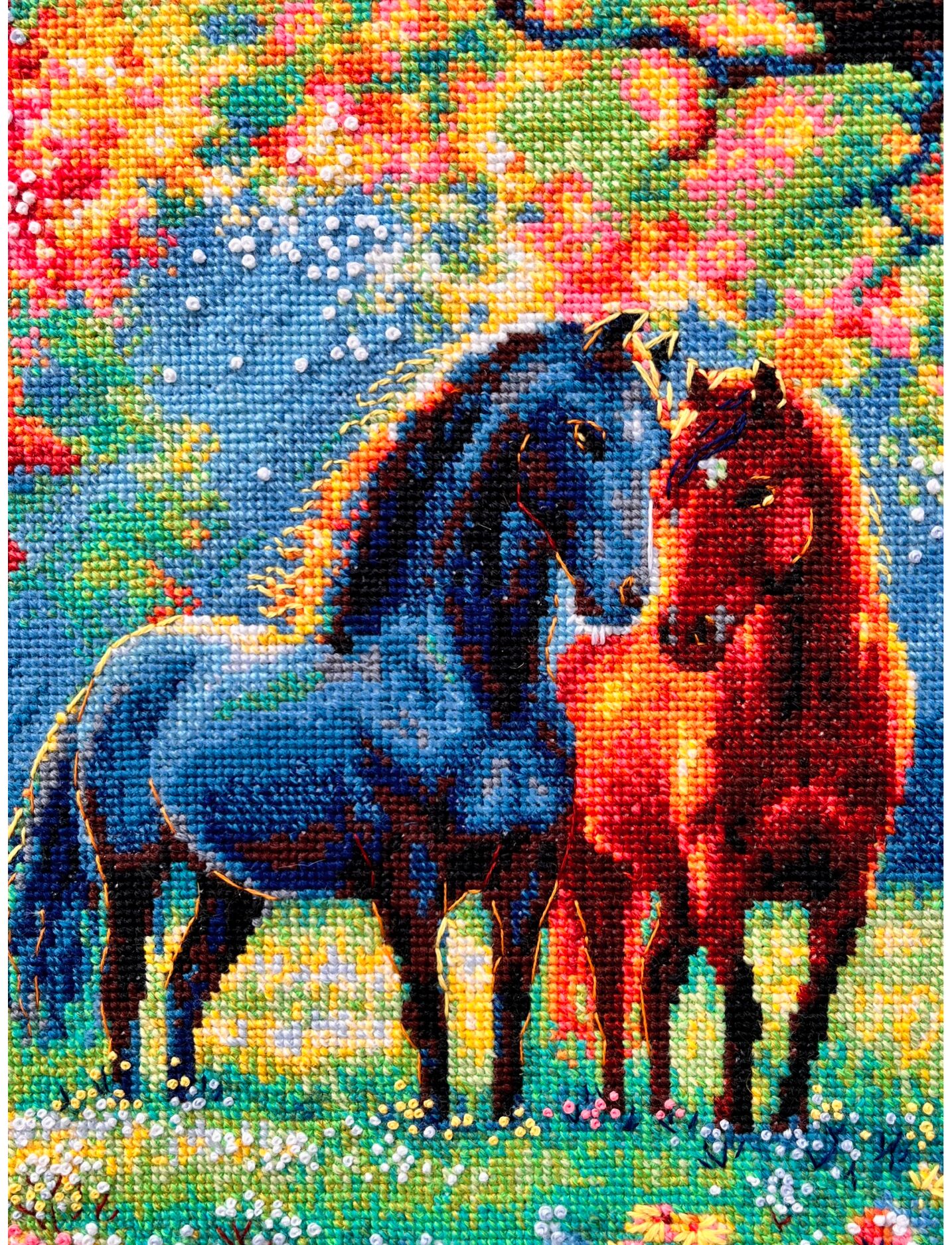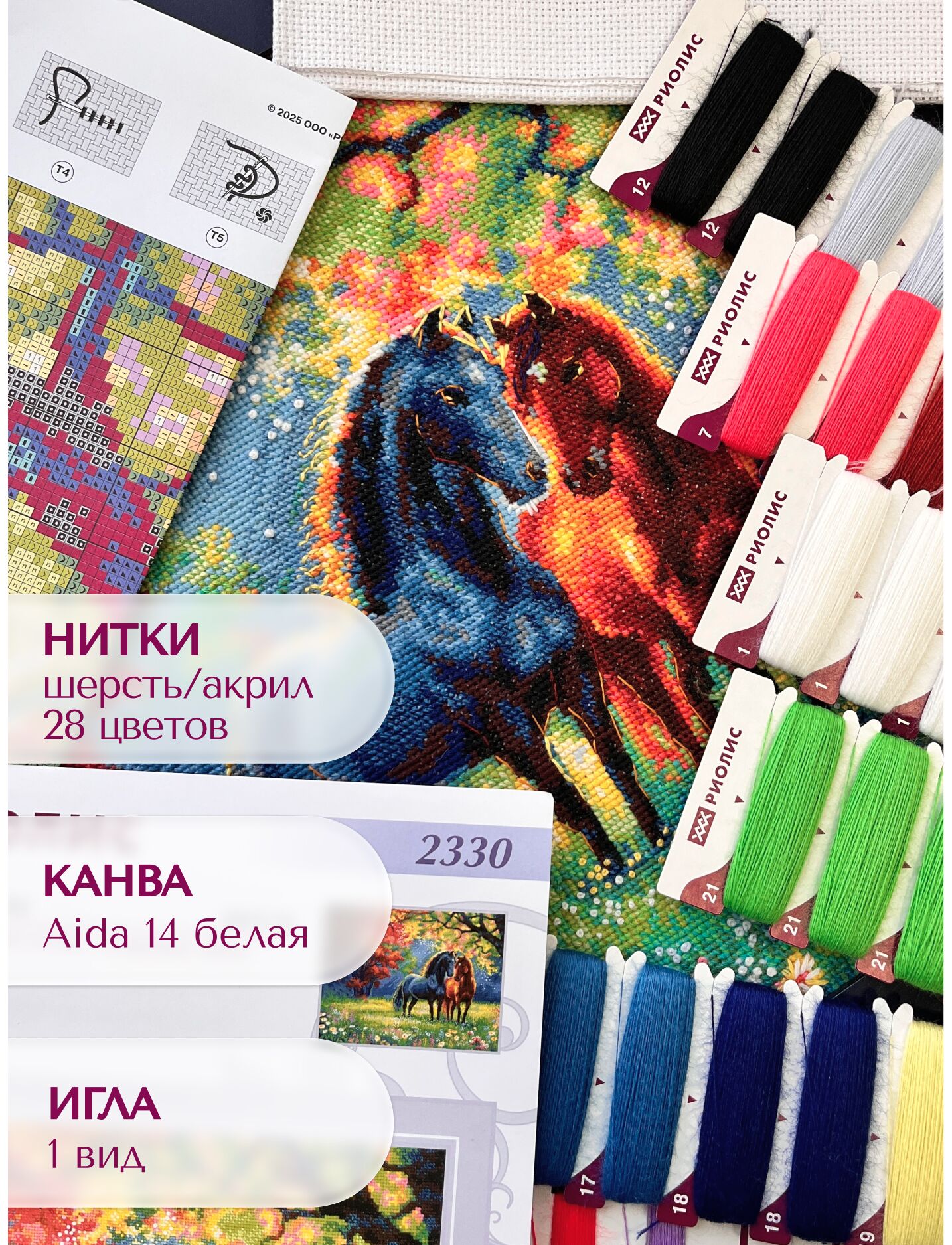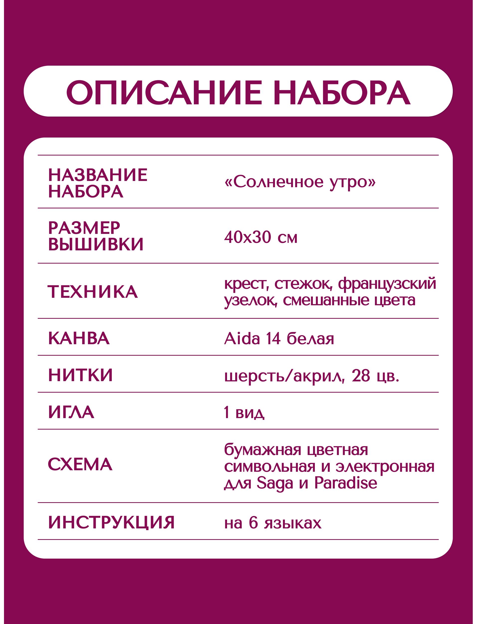 В наборе используются техники: крест, стежок, французский узелок, смешанные цвета.