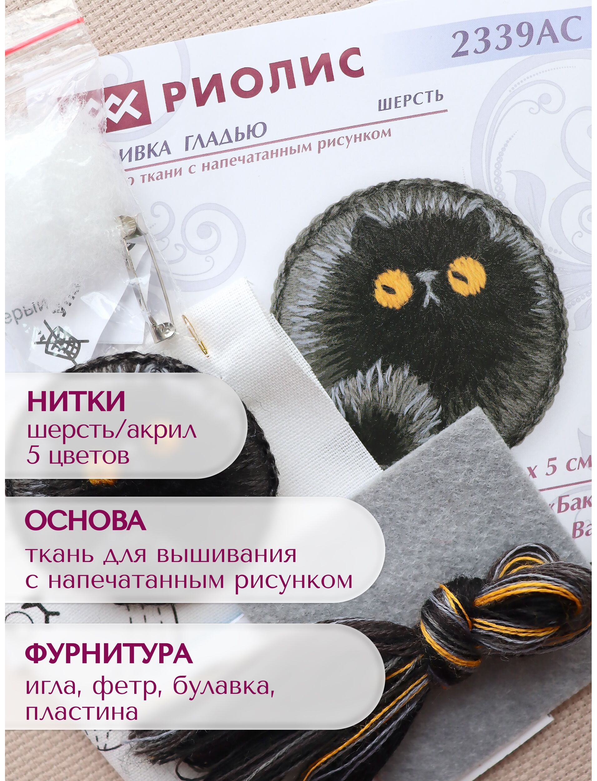 В набор также входит: фетр, наполнитель, булавка для броши, 1 пластина.
