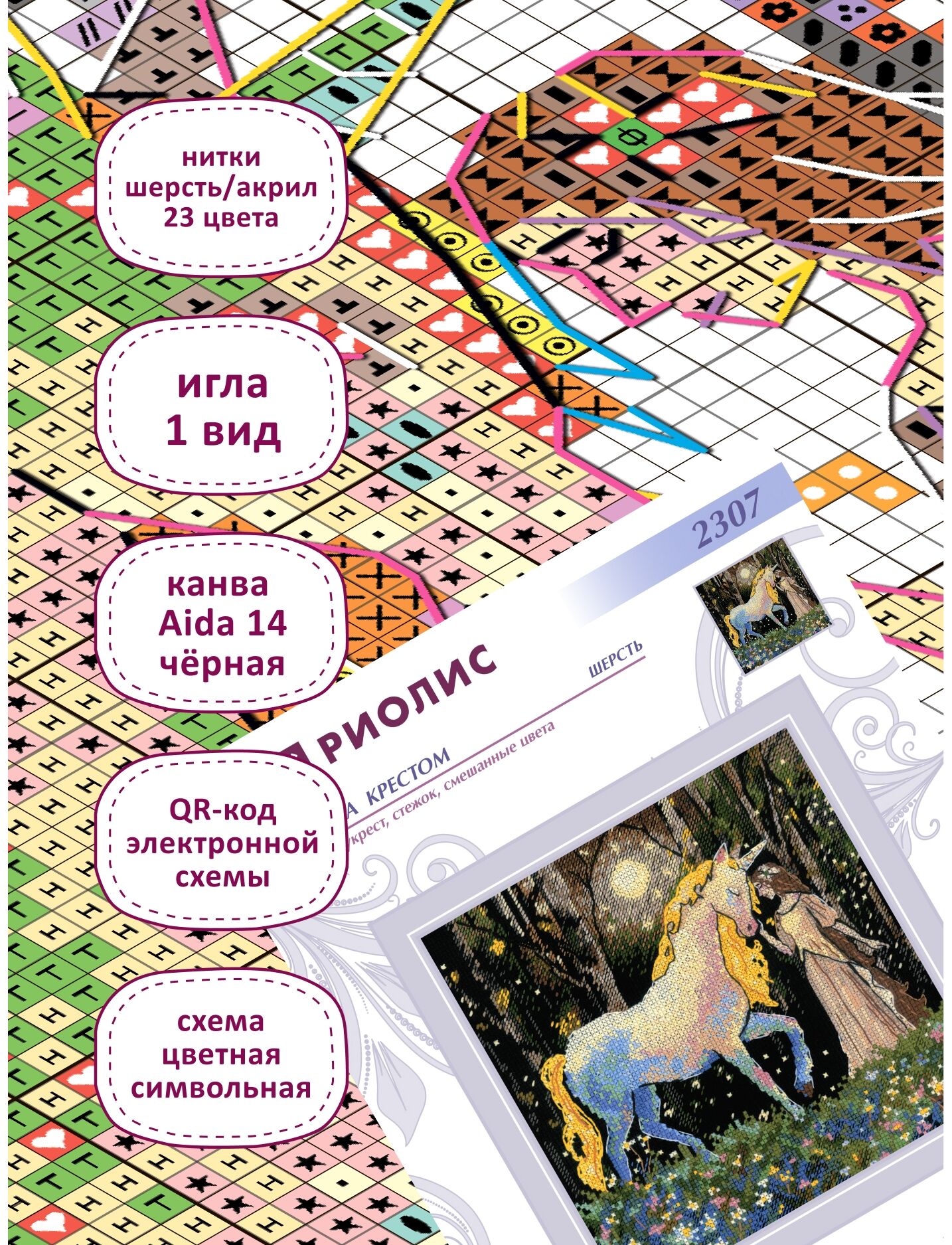 В наборе используются техники: крест, полукрест, стежок, смешанные цвета.