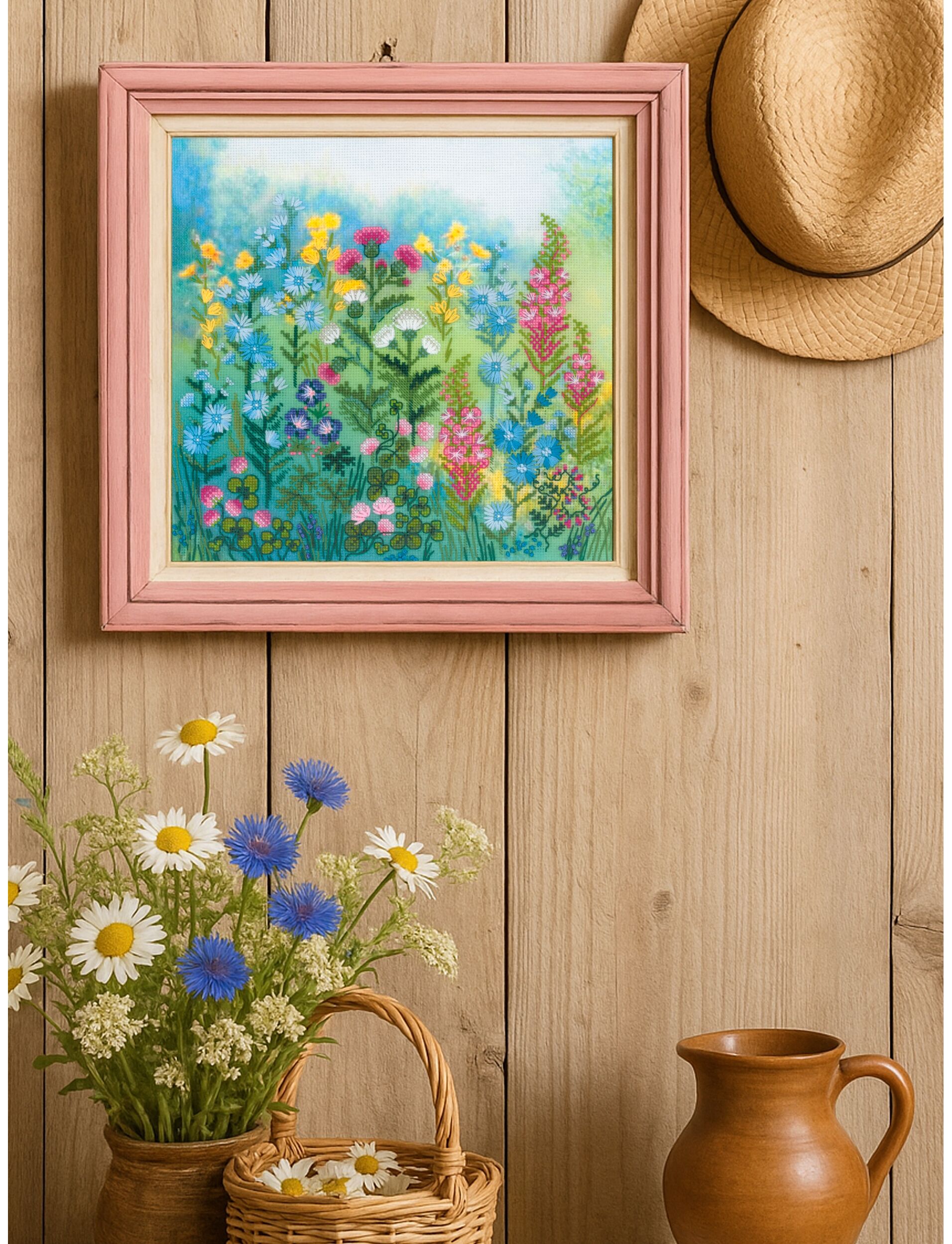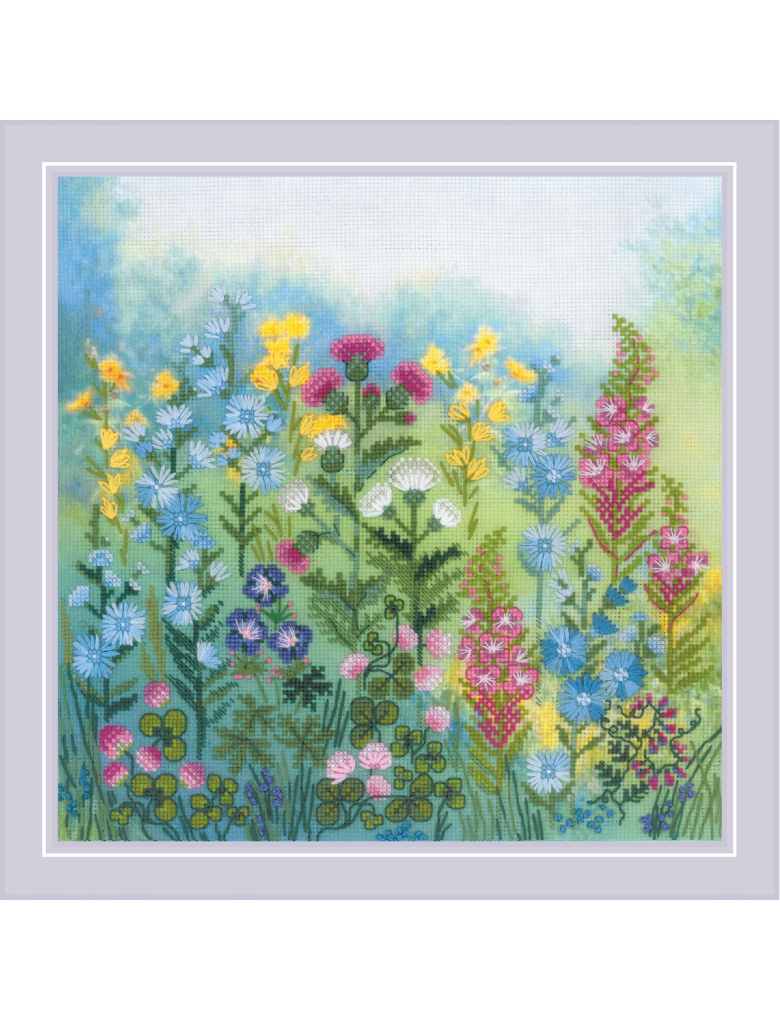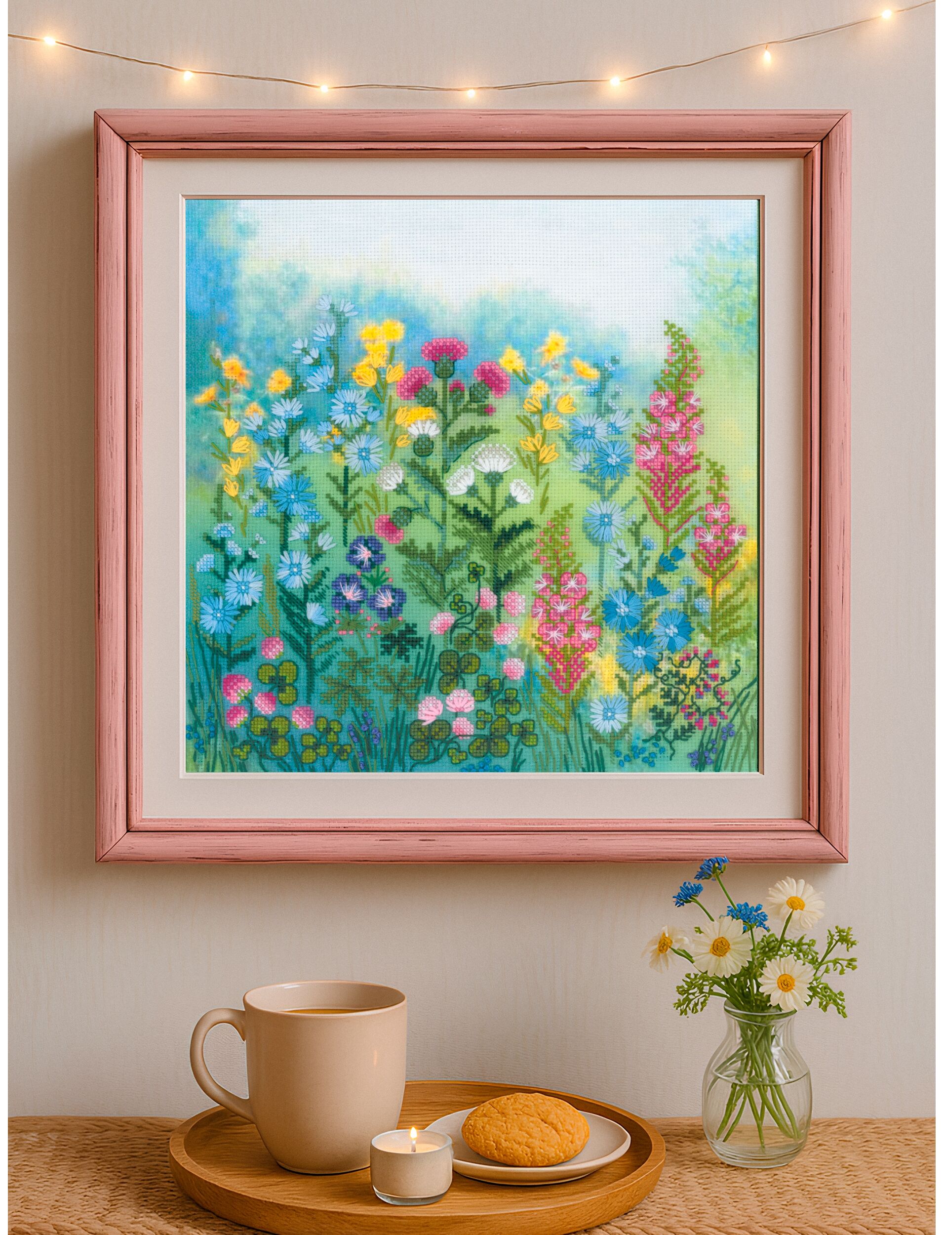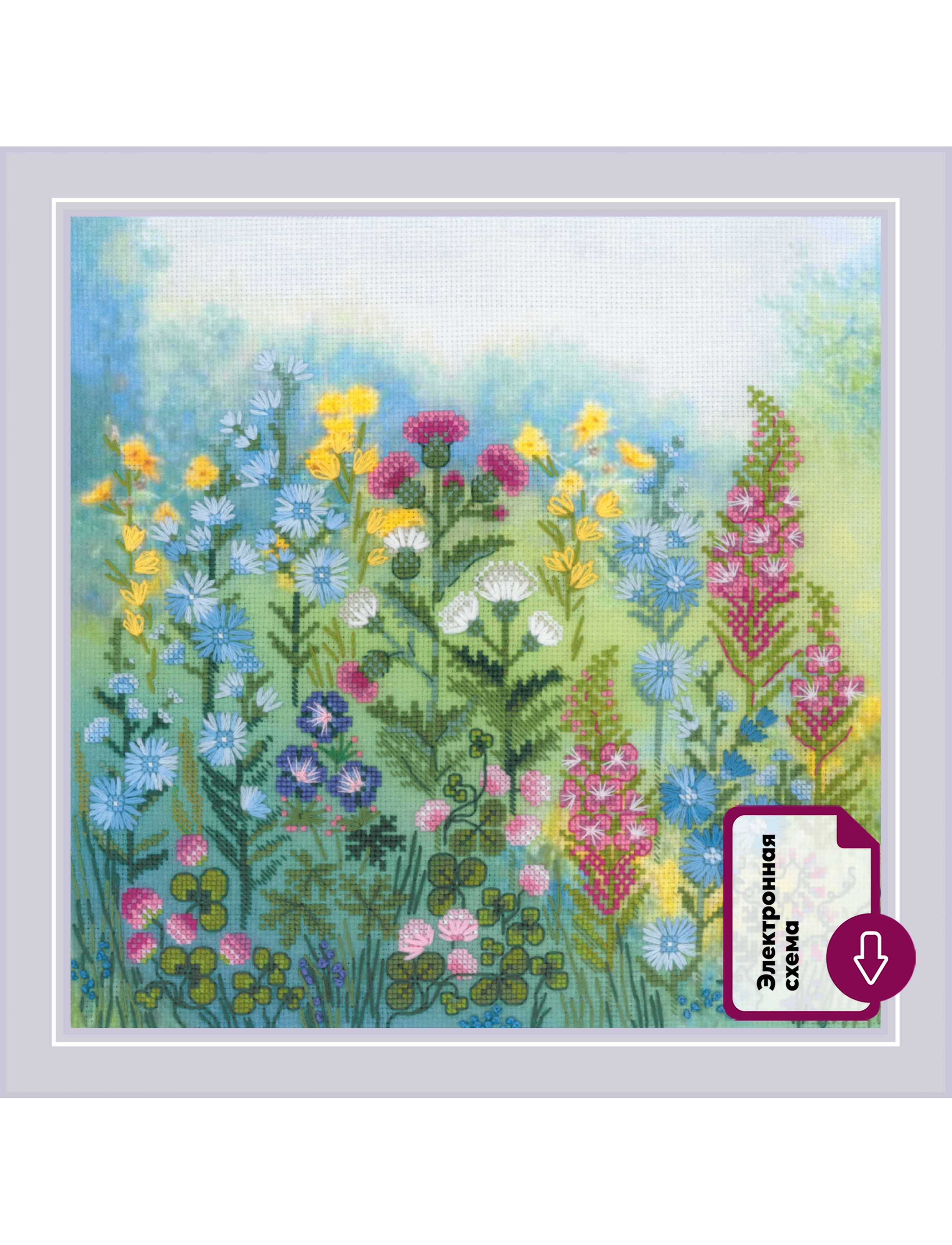 В наборе используются техники: крест, полукрест, стежок, французский узелок по канве с напечатанным фоном.