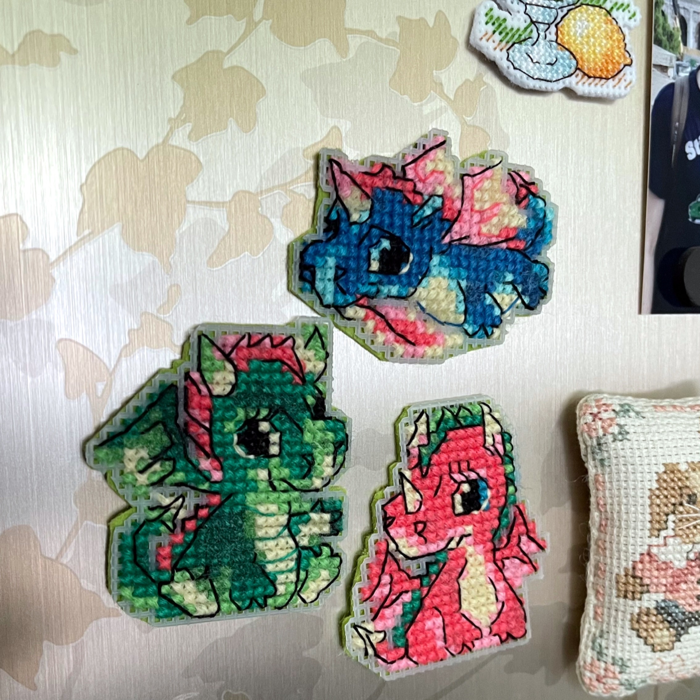 Всё необходимое уже есть в наборе: шерстяные нитки, пластиковая канва, отрез фетра для оборотной части, крепкие магниты, игла, понятные схема и инструкция.